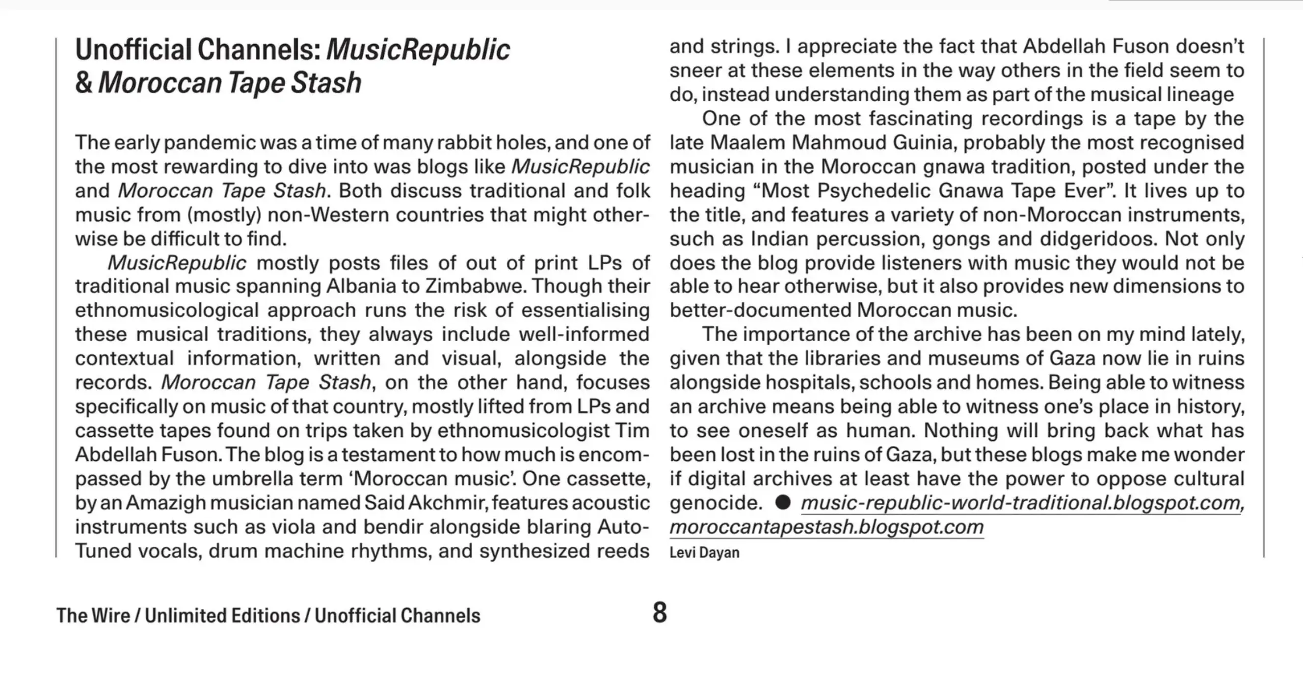 Levi Dayan. “Unofficial Channels: MusicRepublic & Moroccan Tape Stash”. The Wire 484, p. 8. June 2024.